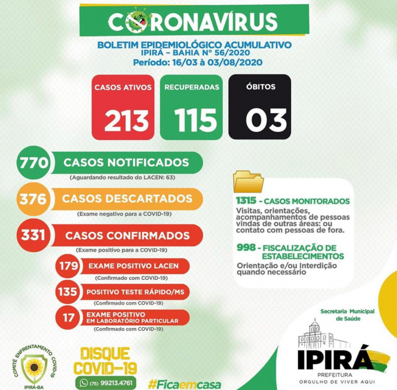 Os novos casos confirmados da Covid-19 em Ipirá divulgados no seu último boletim desta segunda-feira (03), informam que o município atingiu um total de 331 casos confirmados e 3 óbitos.