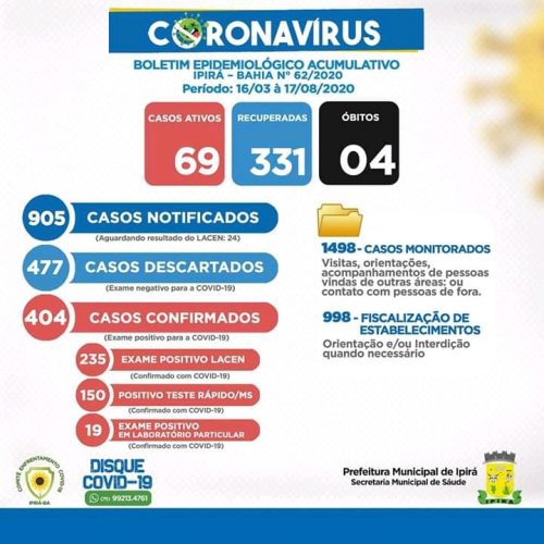 Em novo boletim epidemiológico divulgado na noite desta segunda-feira (17), O Comitê de Combate a Covid-19, através da Prefeitura Municipal de Ipirá confirmou mais 12 novos casos positivos no município. Total chega a 404 casos.