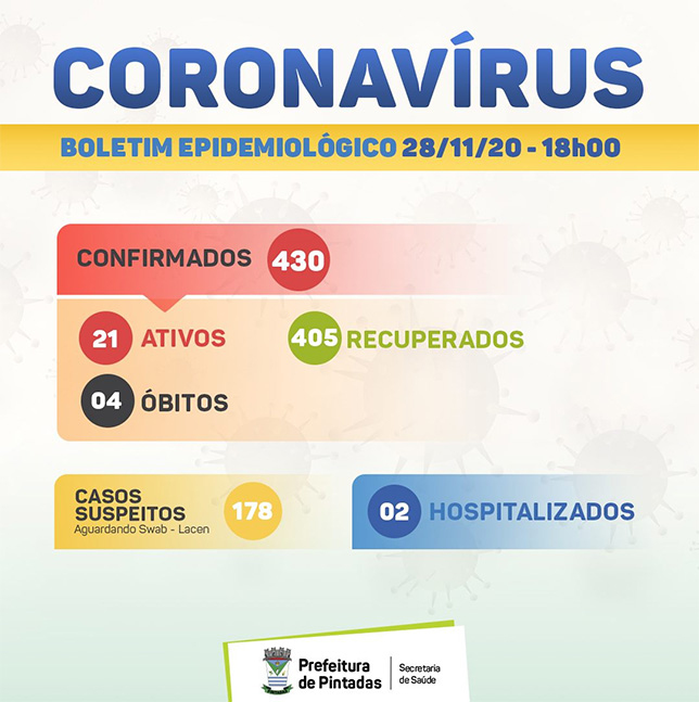Com isso, o município tem agora 04 mortes e 430 infectados. O informativo trouxe também mais 101 curados, elevando o total de recuperados para 405. Os casos ativos somam 21.