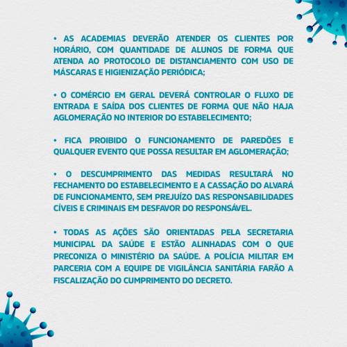 - Todas as ações são orientadas pela Secretaria Municipal da Saúde e estão alinhadas com o que preconiza o Ministério da Saúde. A Polícia Militar, em parceria com a equipe de Vigilância Sanitária, farão a fiscalização do cumprimento do decreto.