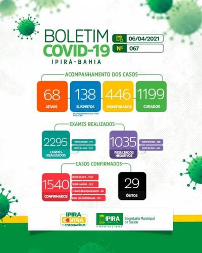 Até o momento, Ipirá acumula 1.540 casos de covid-19 desde o início da pandemia, com 1.199 curados, 68 ativos e 29 óbitos. Além disso, outras 138 pessoas estão com suspeitas e aguardam o resultado dos exames.
