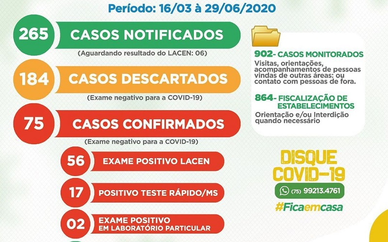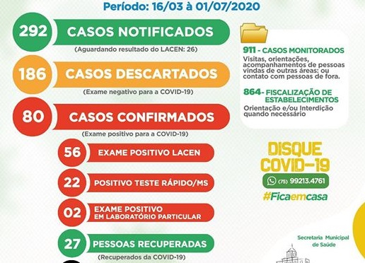 Ipirá registra mais 5 casos de Covid-19 e total chega a 80