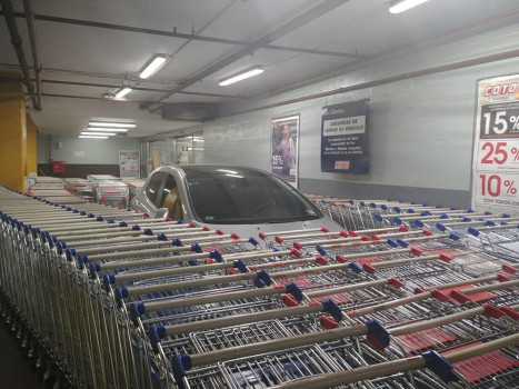 Cliente estaciona mal em supermercado e encontra veículo cercado por carrinhos