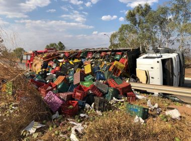 Caminhão com carga de frutas tomba na BR-135 em Barreiras