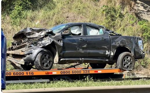 Caminhonete fica destruída após ser atingida por pneu e cair de viaduto na BR-324