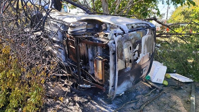 Duas pessoas ficam feridas e veículo pega fogo após colidir contra árvore na BR-324