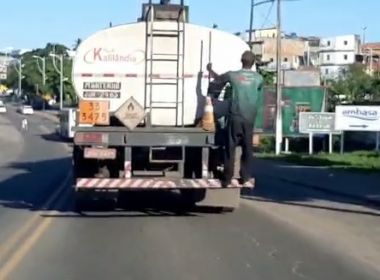 Um flagrante na manhã desta terça-feira (16) mostra um homem dependurado em um caminhão, furtando combustível em Candeias, na Região…