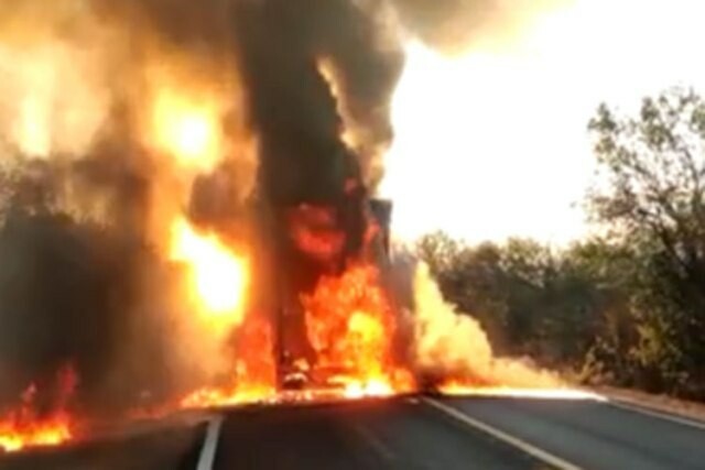 Caminhão e moto pegam fogo após acidente acidente; uma pessoa morreu