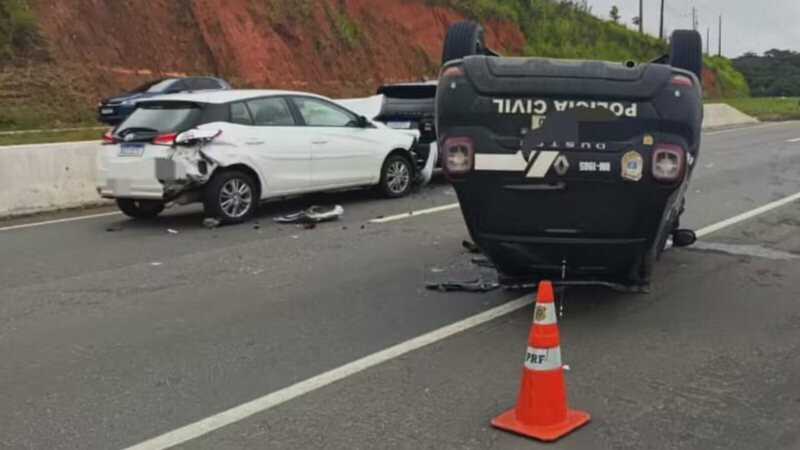 Viatura da Polícia Civil capota após se envolver em acidente com outros cinco carros