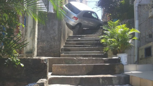 Carro despenca em escada enquanto o dono lavava o veículo em Salvador
