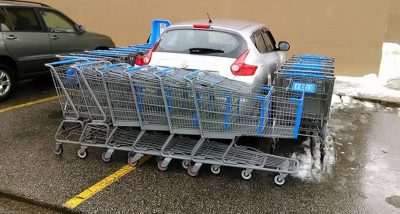 Homem estaciona em duas vagas no supermercado e acaba “preso” no local