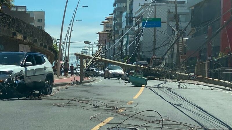 Poste cai no meio da rua e atinge veículos em Salvador; veja vídeo